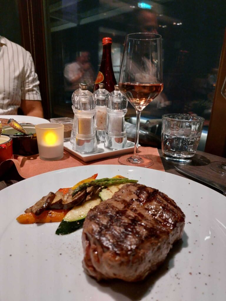 Zum Abschluss des Tages genießen wir ein Abendessen im Surf & Turf – mit einem Glas Wein und einem guten Steak. Und danach? Vielleicht noch ein Absacker in der Studio Bar (hier ist immer sehr wenig los) oder ein Drink auf dem eigenen Balkon, begleitet vom Rauschen der Wellen.